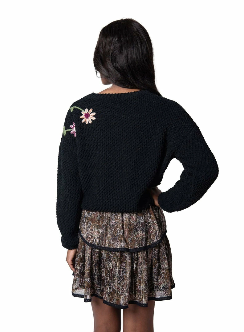 Color: Black knit, multi color floral detail