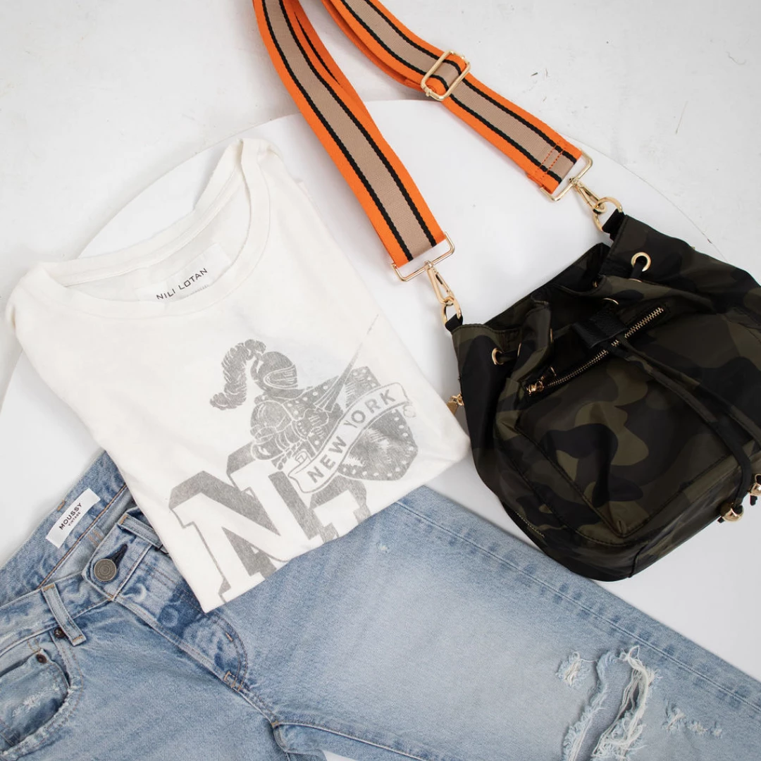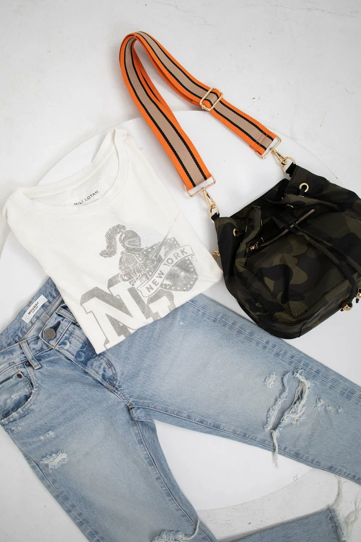 Style: Drawstring Bucket Bag + Orange/ White Stripe
