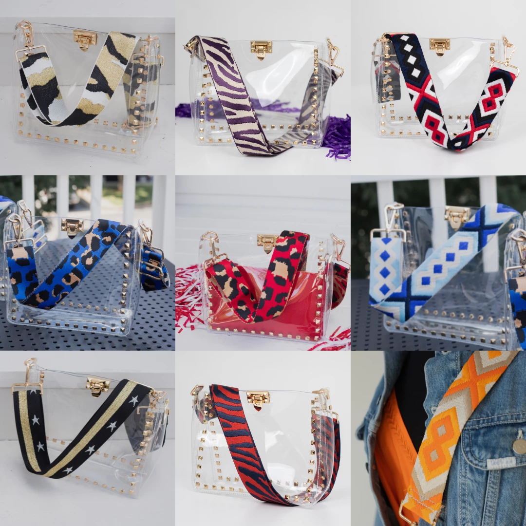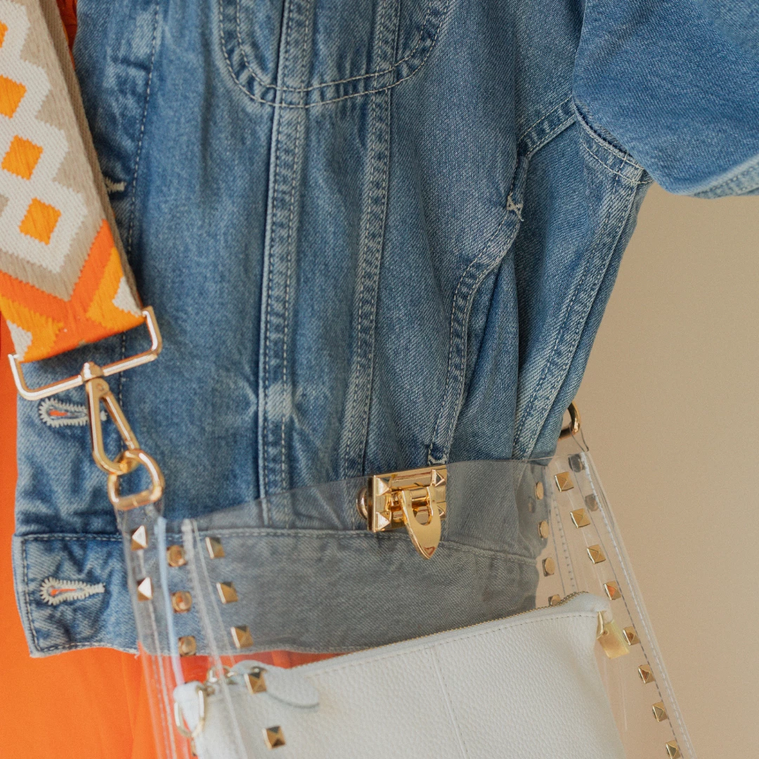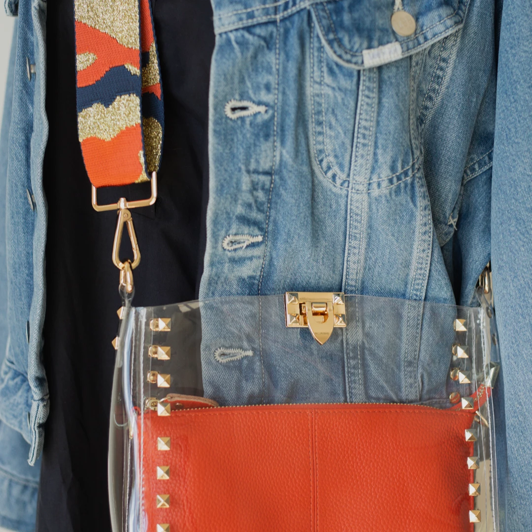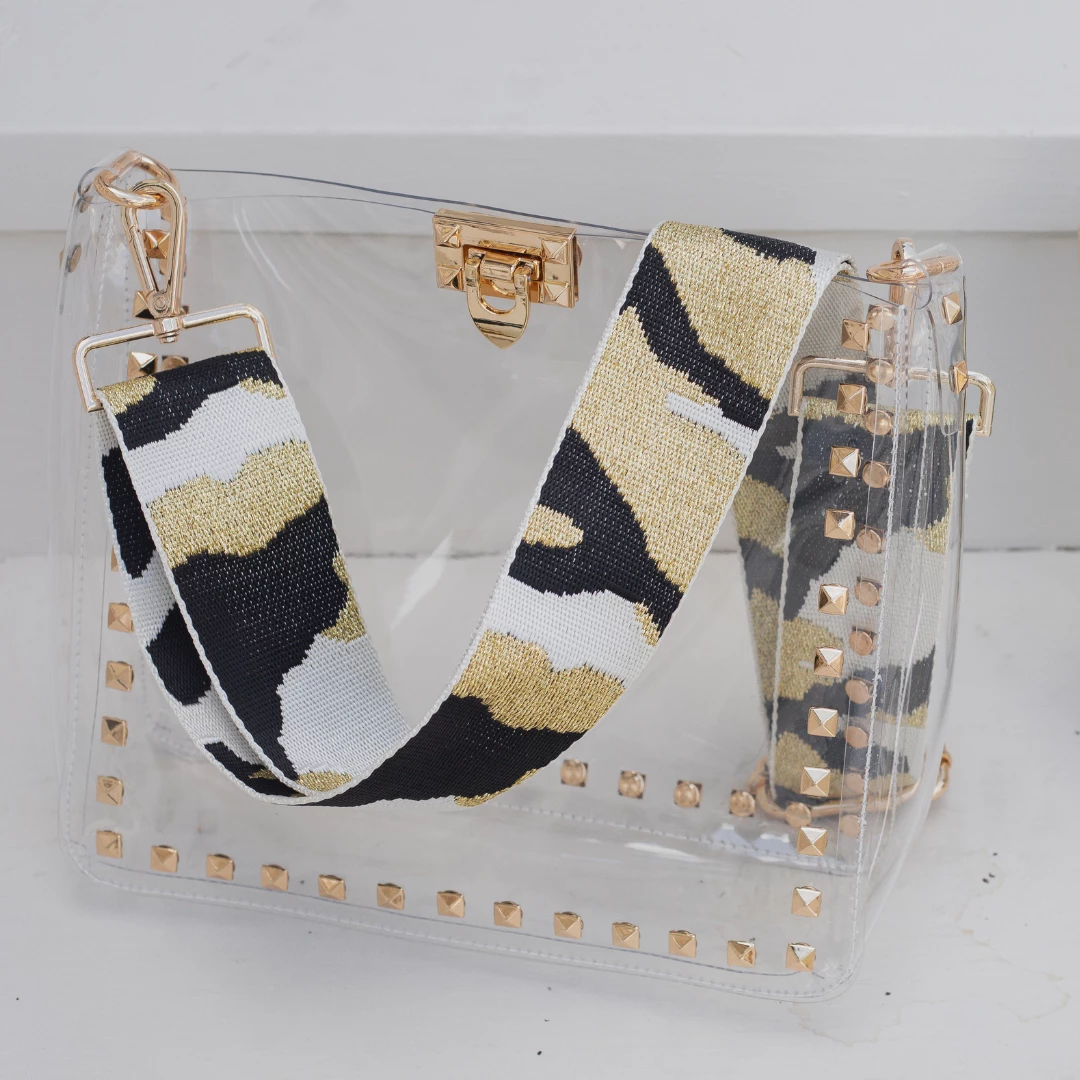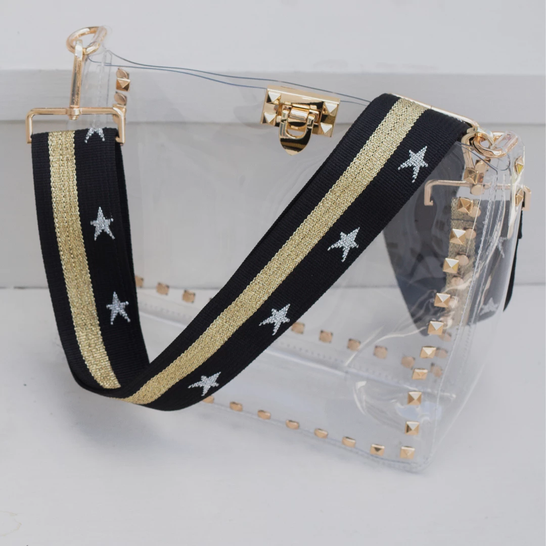 Style: Event-approved clear purse with gold studs and option for interchangeable straps