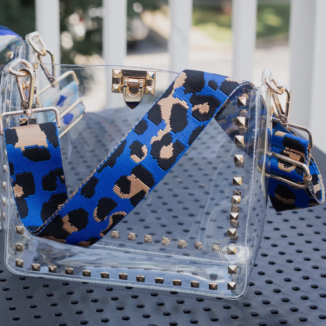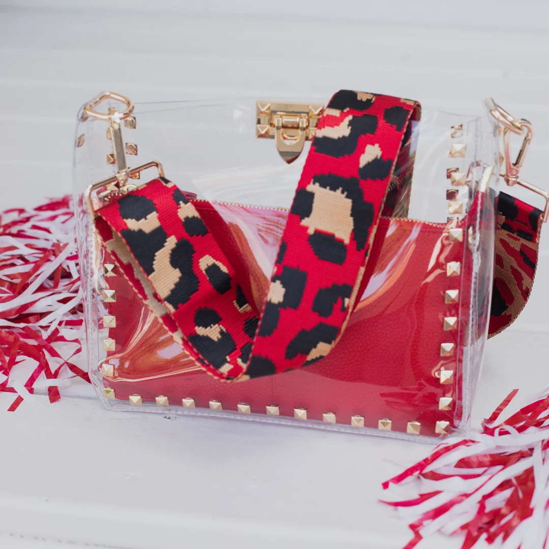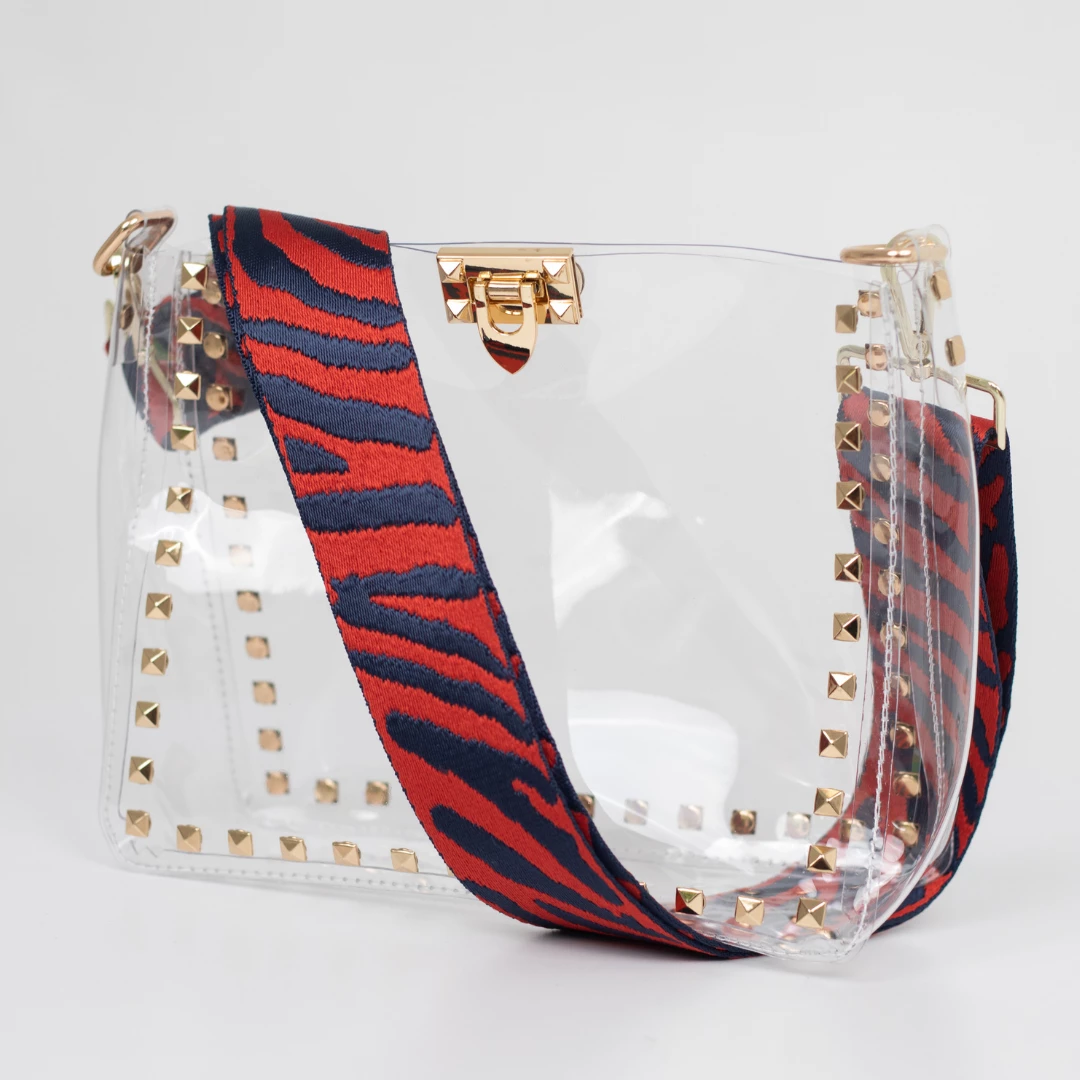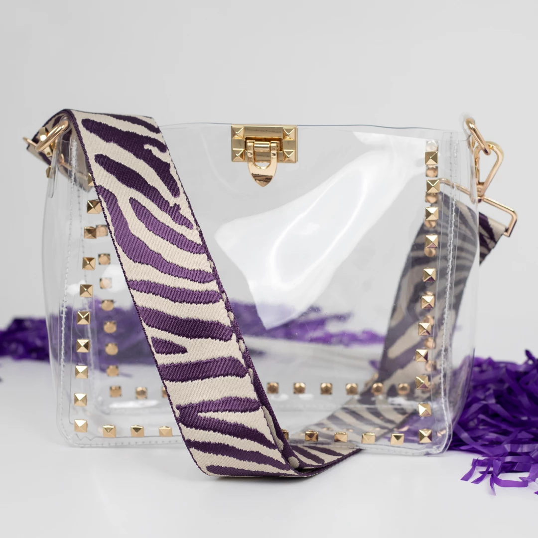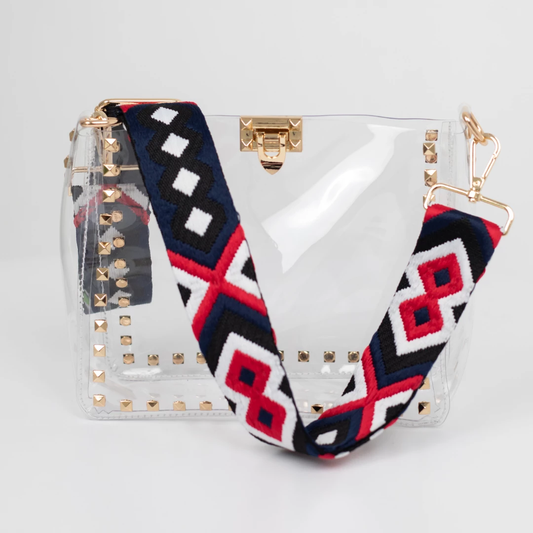 Style: Event-approved clear purse with gold studs and option for interchangeable straps