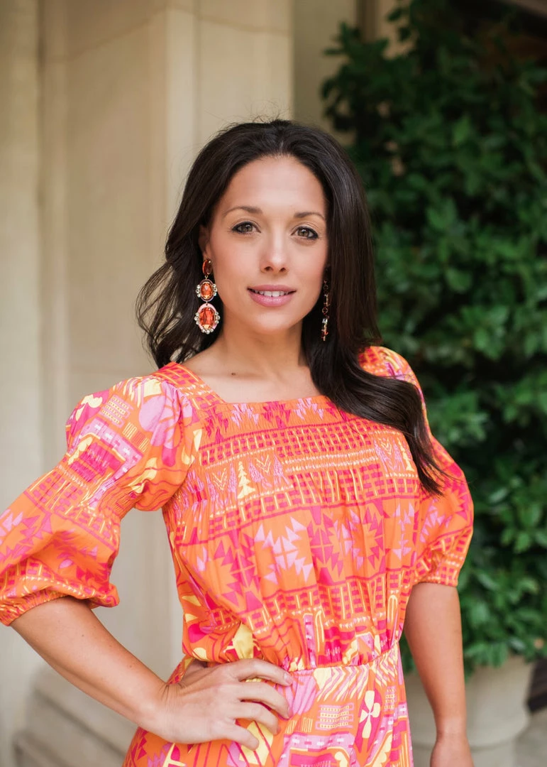 Hand-crafted by Balinese artisans, the Orange Oval Drop Earrings by Sheridan French are illuminated by a frame of pink acrylic mirror and glistening stones, all nestled in beautiful brass settings.