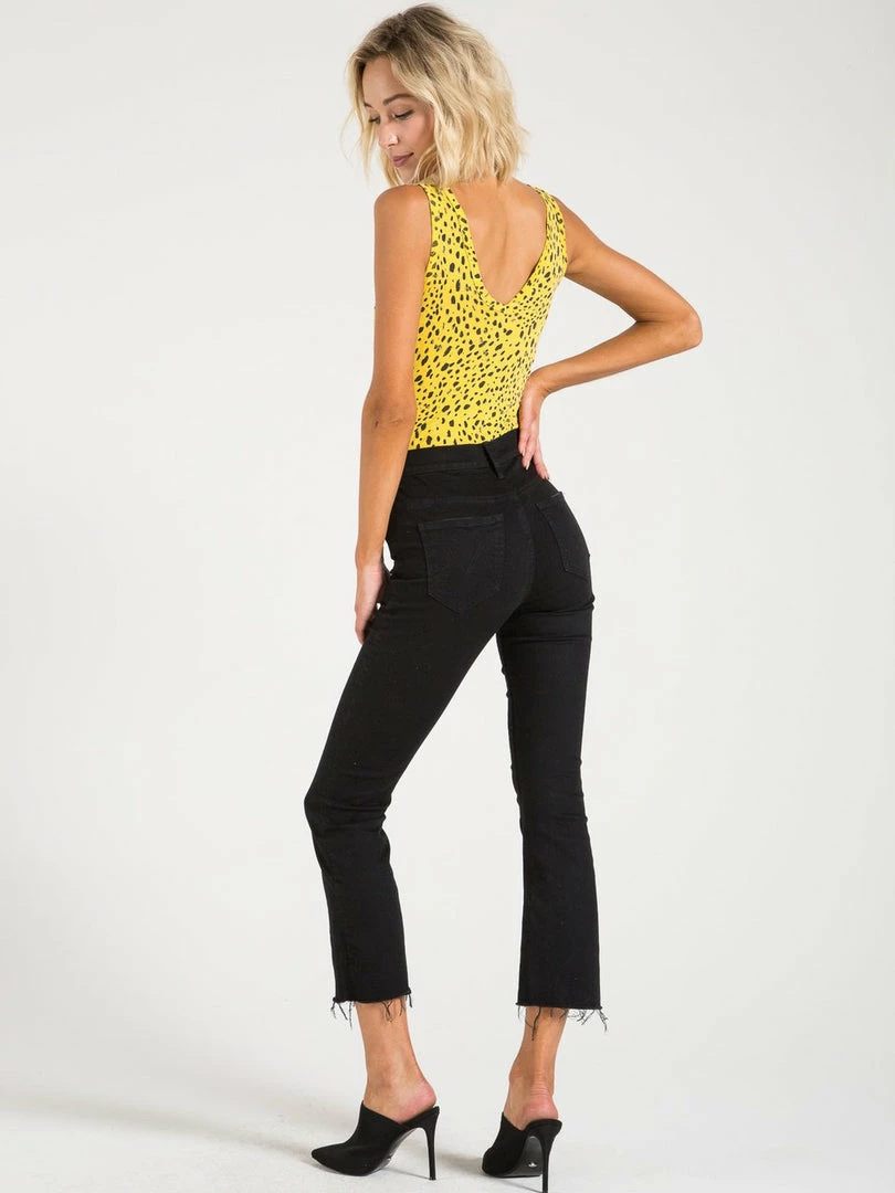 Fitted tank V neck bodysuit with hand deconstruction on neckline and armhole, thong back and snap closure. Hand sewn metal plaque on wearersâ left hem.