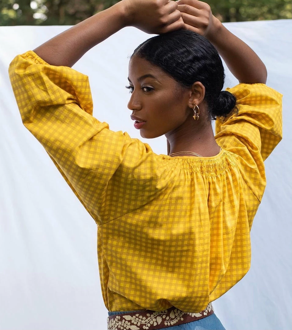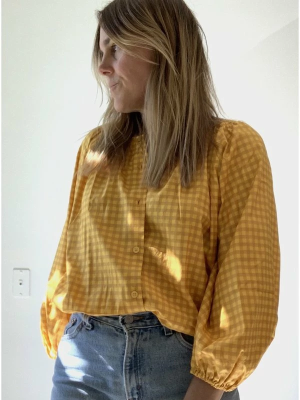 This timeless blouse features a smocked collar, button front and voluptuous sleeves. Blouse measures 24″ in length.